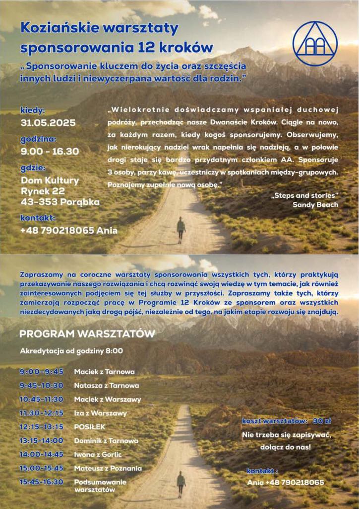 Grupa AA „Bez nazwy” z Kóz zaprasza na coroczne warsztaty sponsorowania, które odbędą się 31 maja 2025 roku w Domu Kultury w Porąbce.