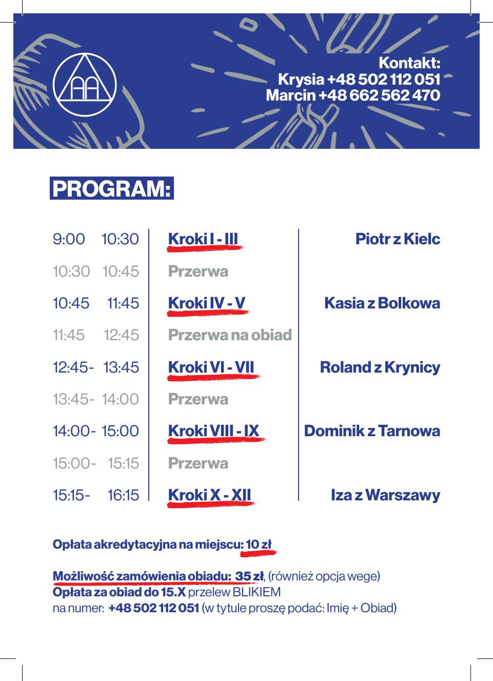 INTERGRUPA MAŁOPOLSKA – PÓŁNOC ORAZ GRUPA AA „WDZIĘCZNOŚĆ” ZAPRASZAJĄ SERDECZNIE NA WARSZTATY 12 KROKÓW AA, KTÓRE ODBĘDĄ SIĘ 18 PAŹDZIERNIKA W KRAKOWIE NA UL. WĘŻYKA 6.