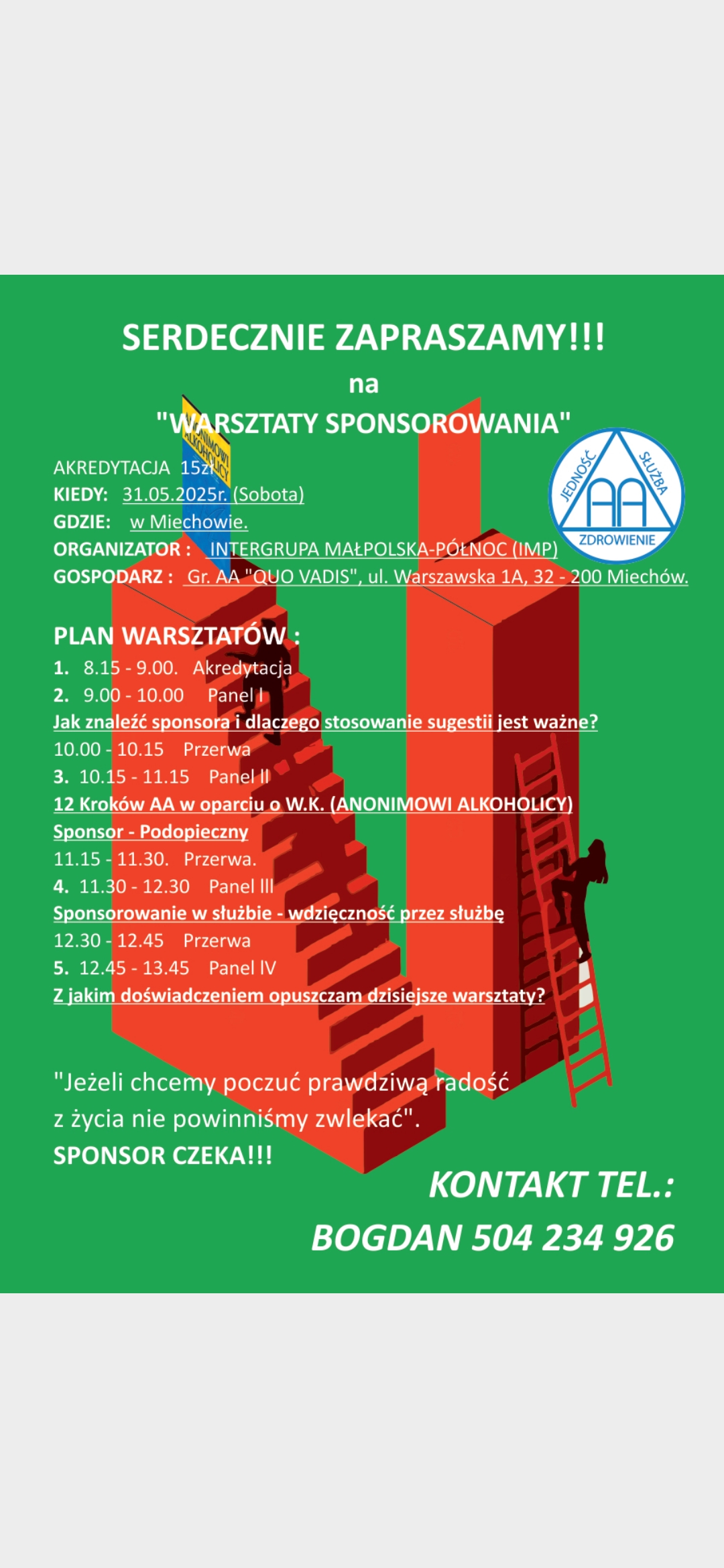 INTERGRUPA MAŁOPOLSKA – PÓŁNOC ORAZ GRUPA AA „QUO VADIS” Z MIECHOWA ZAPRASZAJĄ SERDECZNIE NA WARSZTATY SPONSOROWANIA, KTÓRE ODBĘDĄ SIĘ 31 MAJA W MIECHOWIE NA ULICY WARSZAWSKIEJ 1 A. WIECEJ INFORMACJI W ULOTCE.